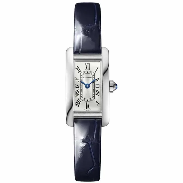 Tank Américaine Mini mit Quarzwerk | Gehäuse aus Stahl | Mehrkantaufzugskrone mit einem facettierten synthetischen blauen Spinell | Versilbertes Zifferblatt mit Sonnenschliff, schwertförmige Zeiger aus gebläutem Stahl | Saphirglas | Armband aus glänzendem blauem Alligatorleder | Stiftschließe aus Stahl | Gehäuseabmessungen: 28,0 mm x 15,2 mm, Höhe: 6,5 mm | Wasserdicht bis zu 3 bar | Referenz WSTA0081 | 3.650 Euro