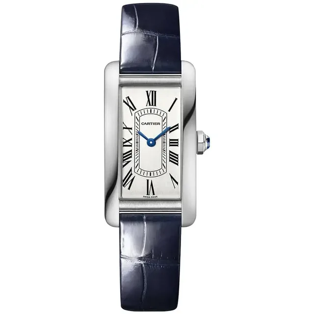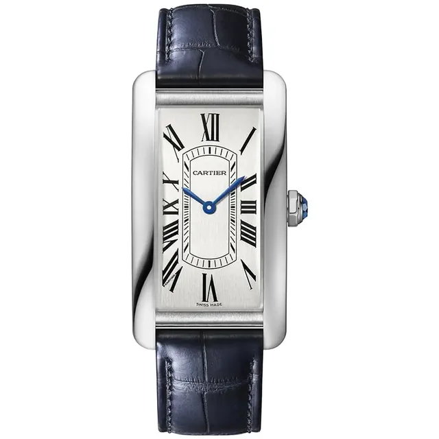 Tank Américaine, großes Modell | mechanisches Uhrwerk mit Automatikaufzug | Gehäuse aus Stahl, Mehrkantaufzugskrone mit einem facettierten synthetischen blauen Spinell | Satiniertes silberfarbenes Zifferblatt, schwertförmige Zeiger aus gebläutem Edelstahl, Saphirglas | Armband aus halbmattem marineblauem Alligatorleder, austauschbare Faltschließe aus Stahl | Gehäuseabmessungen: 44,4 mm x 24,4 mm. Höhe: 8,6 mm | Wasserdicht bis zu 3 bar | Referenz WSTA0083 | 6.700 Euro