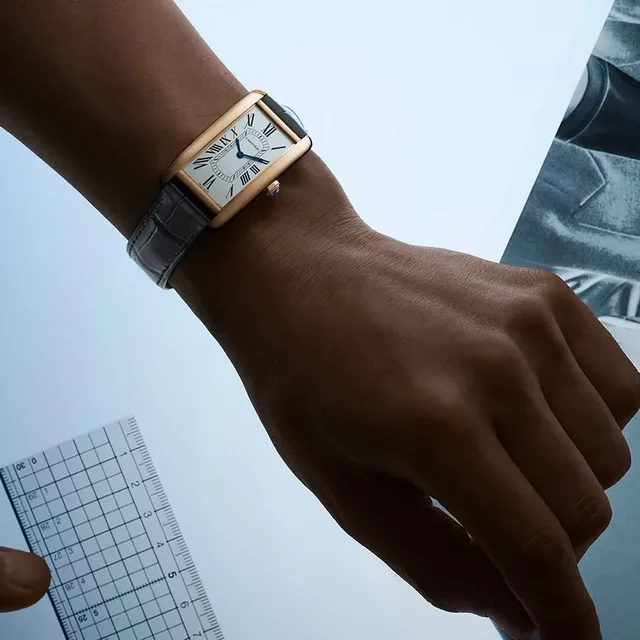 Die 1917 auf den Markt gebrachte Tank gehört zu den Favoriten der Kollektionen von Cartier und hat sich über die Jahre in unzähligen Iterationen bewiesen, ohne auf ihre charakteristischen Merkmale wie das rechteckige Gehäuse, die Eisenbahn-Minuterie, die schwertförmigen blauen Zeiger und die Krone mit Saphir-Cabochon zu verzichten.