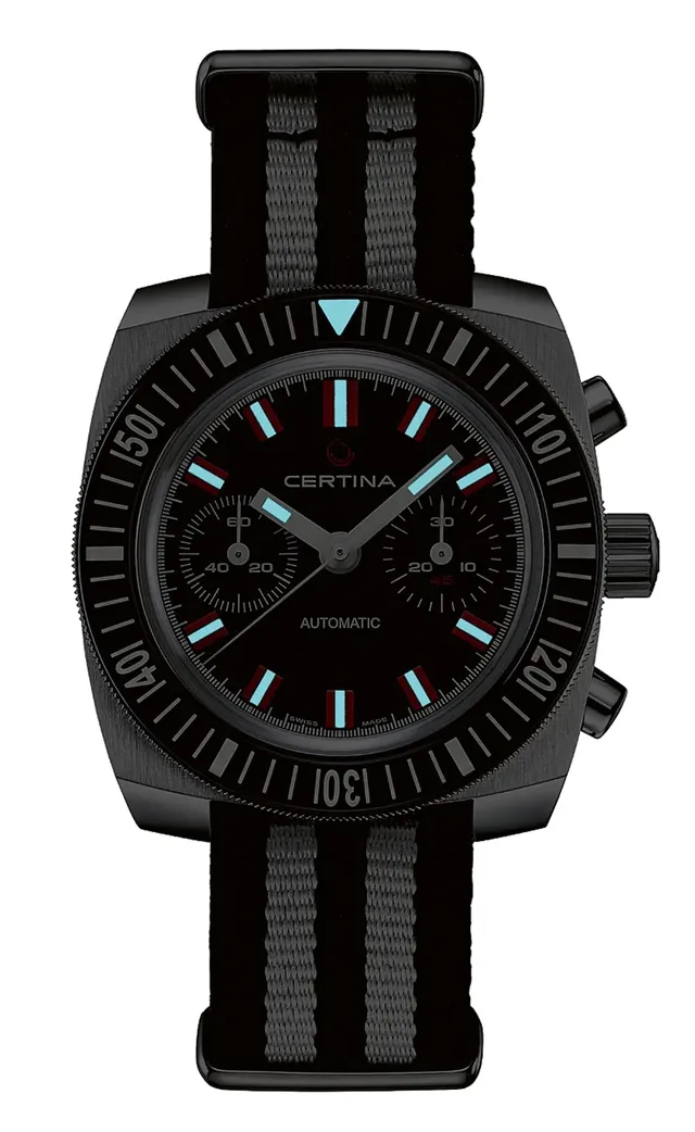 Der markante DS Chronograph Automatic 1968 von Certina mit einem selten zu findenden kissenförmigen Gehäuse ist von einem Modell der 1960er-Jahre inspiriert. Doch sein Herz schlägt im Takt eines modernen Automatikkalibers mit Siliziumspirale. Seine Stoppfunktion und die Druckfestigkeit bis 20 bar sowie die einseitig drehbare Lünette machen ihn nicht nur zu einem sportlichen Accessoire, sondern zu einer funktionalen Taucheruhr – hier im Test.