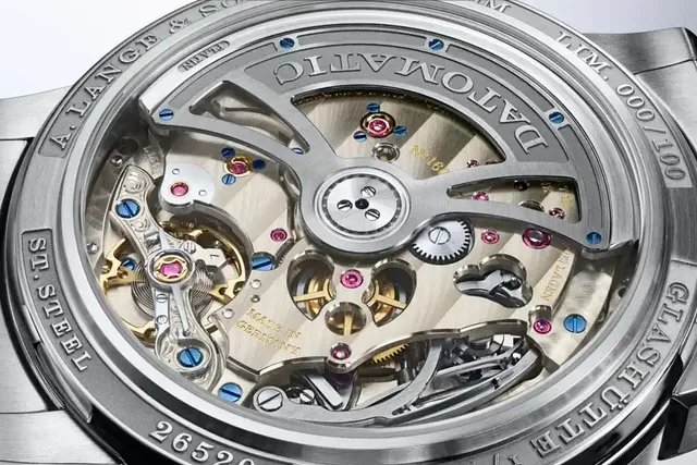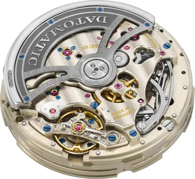 Auch für dieses auf 100 Exemplare limitiert Modell wurde – wie bei A. Lange & Söhne üblich – hier konkret in sechs Jahren ein neues Kaliber entwickelt – das mittlerweile 71. Manufaktur- und bereits das 13. Chronographenwerk. Dabei markiert das L156.1 Datomatic eine Premiere: Es ist das erste Lange-Chronographenkaliber mit automatischem Aufzug.Es arbeitet mit einer Frequenz von vier Hertz und bietet eine Gangautonomie von 50 Stunden. Um das charakteristische Zifferblattdesign mit Wochentag und Großdatum beibehalten zu können, waren spezielle Konstruktionen erforderlich. In der Folge werden sowohl Stoppsekunden als auch -minuten aus der Mitte angezeigt.