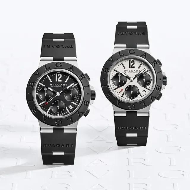 Ausgestattet mit einem neuen Chronographenwerk und einem etwas größeren Gehäuse (41 mm statt 40 mm) ist die Bulgari Aluminium jetzt in zwei Designvarianten erhältlich. Das schwarze oder weiße Zifferblatt ist mit schwarzen Zählern versehen, während die Zeiger und Indizes mit Leuchtmasse versehen sind, die auch bei schlechten Lichtverhältnissen eine klare Anzeige ermöglicht. Das mechanische Uhrwerk mit Automatikaufzug B381 mit Chronographen- und Datumsfunktion sorgt für eine präzise Zeitmessung. Die neue Version des Chronographenkalibers zeugt wieder von einer Sellita-Basis, die mit einem Dubois-Depraz-Chronographenmodul ausgestattet ist. Die Krone und die Chronographendrücker aus DLC-beschichtetem Titan verleihen der Uhr zusätzliche Widerstandsfähigkeit und Stil.Die ursprüngliche Variante mit dem schwarz-weißen Zifferblatt wurde mit dem neuen Kaliber aktualisiert. Das Modell verfügt über ein schlankes Aluminiumgehäuse mit einem Gehäuseboden aus Titan, der mit DLC beschichtet ist, um die Haltbarkeit und Kratzfestigkeit zu erhöhen. Die schwarze Kautschuklünette mit dem Doppellogo verleiht dem bis zu 100 m wasserdichten Modell einen sportiven Touch. Passend dazu unterstreicht das schwarze Kautschukarmband mit Aluminium-Gliedern und Dornschließe aus Aluminium das Design. Ganz neu ist das Zifferblatt im All-Black-Design.