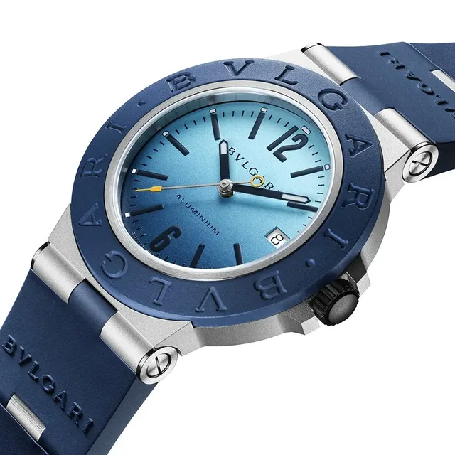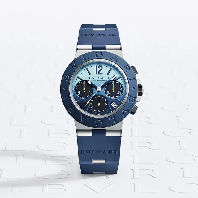 Der Aluminium-Capri-Chronograph von Bulgari wird von dem bestehenden, mechanischen Kaliber B130 mit Selbstaufzug angetrieben und verfügt über die Drücker für Start/Stopp und Rückstellung auf beiden Seiten der Krone. Das Modell Capri Solotempo bietet wird ebenfalls von einem bestehenden mechanischen Automatikwerk (Kaliber B77) angetrieben, das auch über eine Datumsanzeige verfügt. Das Kautschukarmband mit Aluminium-Gliedern und einer Dornschließe aus Aluminium sorgt für einen bequemen Sitz am Handgelenk.