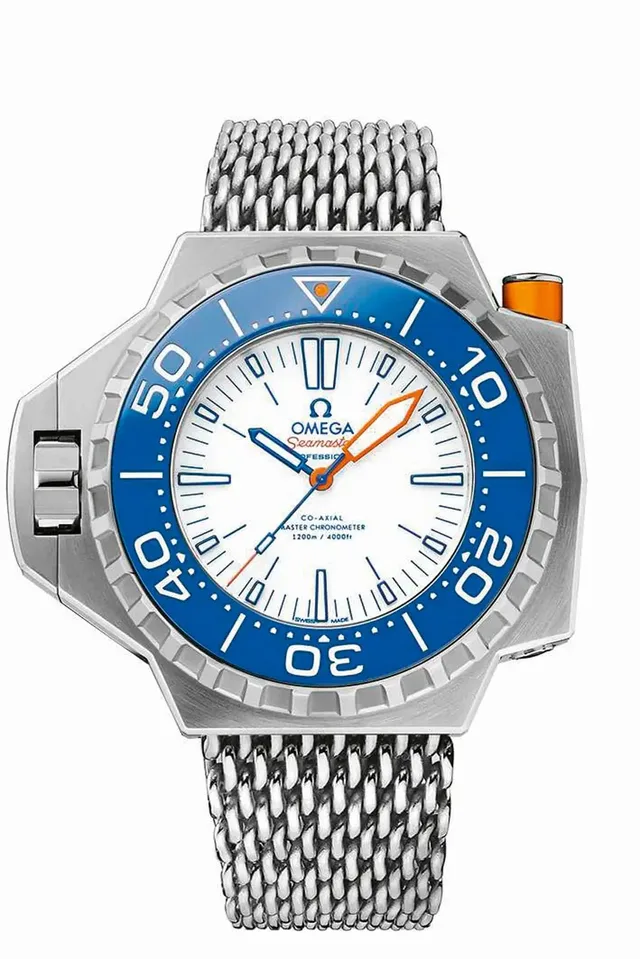 Omega ließ die Seamaster 600 als Seamaster Ploprof 1200m wieder aufleben. Aktuell ist sie dank Gehäuse und Armband aus Titan so leicht, dass sie sich trotz ihrer enormen Größe von 55 mal 48 Millimetern angenehm trägt. Trotz der Druckfestigkeit bis 1200 Meter erlaubt ein Saphirglasboden soga Einblicke ins Automatikkaliber 8912 mit Co-Axial-Hemmung und 60 Stunden Gangreserve. Geblieben sind die Sicherung für den Drehring über den auffälligen Drücker auf der rechten Seite und der Kronenschutzbügel, der sich beim Aufdrehen der Krone öffnet.