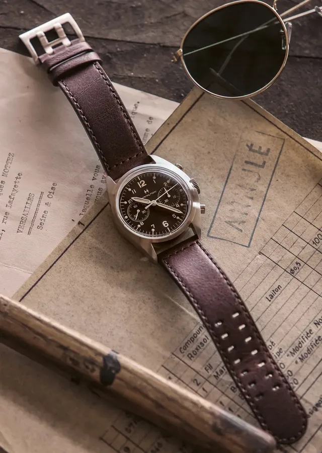 Suchen Sie einen Einsteigerchronographen mit attraktivem Retrodesign, auf das Wesentliche reduzierten Funktionen, guten Alltagseigenschaften und einem verlässlichen Werk? Hamilton hat ihn!Was muss eine Retrouhr können? Und was darf sie? Ist ein Saphirglas okay, obwohl das historische Vorbild ein Acrylglas besaß? Kann man ein Automatikwerk verwenden, wenn das Original von Hand aufgezogen wurde? Und was ist mit einer Datumsanzeige, die heute von vielen als essenziell betrachtet wird? Hamilton hat mit dem neuen Khaki Pilot Pioneer Mechanical Chronograph den Spagat zwischen historischer Korrektheit und Modernisierung geschafft: Mit zwei Zählern und ohne Datum sieht der Zeitmesser so symmetrisch und aufgeräumt aus wie die Pilotenuhren, die Hamilton in den siebziger Jahren an die britische Luftwaffe lieferte. Und er wird wie damals von Hand aufgezogen, was sich dank sattem Klicken und fühlbarem Widerstand als echter Genuss für Mechanikfans herausstellt. Dabei ist das Werk absolut auf der Höhe der Zeit und bietet neben einer erhöhten Gangreserve von 60 Stunden eine Siliziumspirale, die sich von Stößen, Magnetfeldern und wechselnden Temperaturen unbeeindruckt zeigt. Zu guter Letzt besitzt das Deckglas dieselbe Boxform wie früher, besteht aber aus Saphir statt aus kratzempfindlichem Acryl.