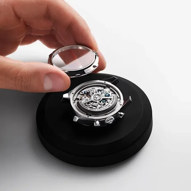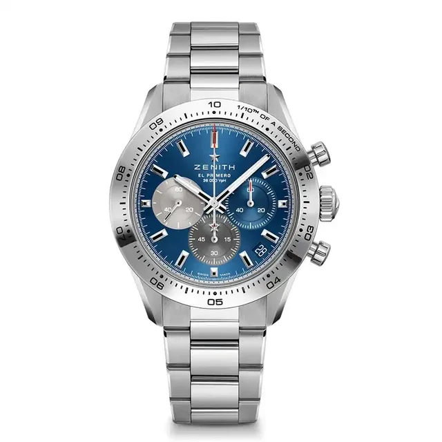 Zenith verfolgt weiterhin das Ziel der Perfektion, und das spiegelt sich im Kaliber El Primero 3600 wider. Dieses moderne Werk ist der Nachfolger des legendären El Primero, des ersten automatischen Hochfrequenz-Chronographenwerks der Welt. Mit einer hohen Frequenz von 5 Hz (36.000 Halbschwingungen pro Stunde) ermöglicht dieses Uhrwerk die Anzeige von Messungen auf die 1/10-Sekunde direkt auf der Lünette und dem Zifferblatt. Zudem bietet das neue Modell eine erweiterte Gangreserve von 60 Stunden. Das Saphirglasboden-Design des Uhrwerks ermöglicht es den Betrachtern, das faszinierende Zusammenspiel von einem blauen Schaltrad und dem offenen Rotor in Form des fünfzackigen Zenith-Sterns zu bewundern. Die Uhr ist bis 10 atm wasserdicht.