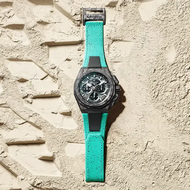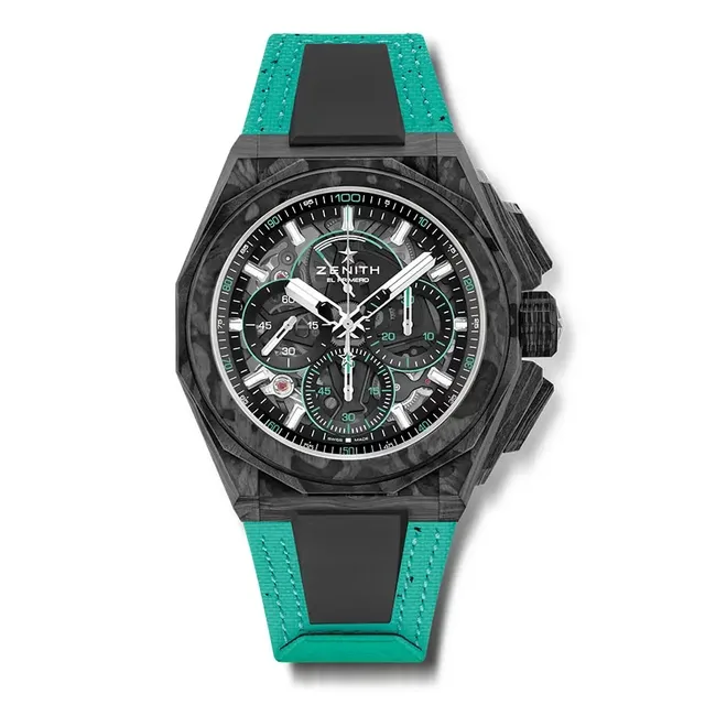 Durch die vollständige Nutzung von widerstandsfähiger Karbonfaser – zum ersten Mal in der Kollektion – einschließlich bei den Drückern und Schutzvorrichtungen hat Zenith die DEFY Extreme E Edition noch leichter gemacht. Die Uhr wiegt mitsamt Armband und Dreifachfaltschließe – ebenfalls aus Karbonfaser – nur 96 Gramm.