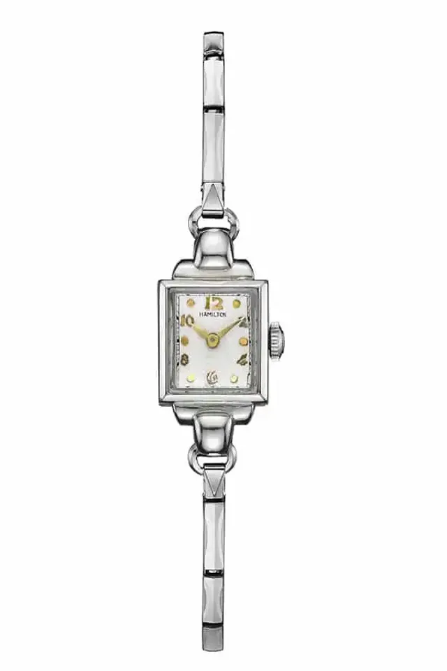 Kitty Oppenheimer, gespielt von Emily Blunt, trägt hingegen eine Lady Hamilton A-2 aus 14 Karat Gold. Das vergoldetes Gehäuse misst 13,5 x 15 mm. Das Zifferblatt ist weiß mit gelbgoldenen Markierungen, arabischen Ziffern und Zeigern. Im Inneren ist ein mechanisches Uhrwerk verbaut.