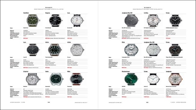 Das Angebot des Uhrenmarkts im Überblick: 90 mechanische Uhren unter 39 Millimeter zeigt die Marktübersicht aus UHREN-MAGAZIN 1.2018 mit Bild, Daten und Preis.