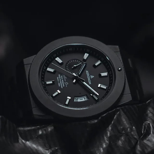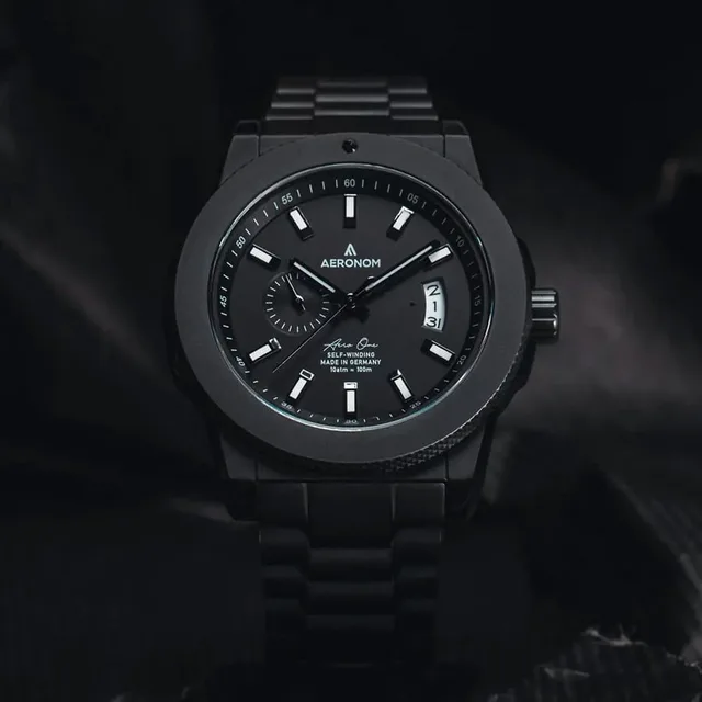 Die Uhr wird von renommierten Uhrmachermeistern in Pforzheim hergestellt und soll laut Marke die nahtlose Verschmelzung von traditioneller Handwerkskunst und urbaner Straßenkultur aufgreifen, dazu werden altehrwürdige Techniken mit dem Geist von Mode, Design und Kunst zusammengebracht. Das Ergebnis mündet in einer markanten und brutalistischen Optik. Die Aero One Blk kommt mit einem Durchmesser von 46 mm, das 316L Stahlgehäuse wird von einer schwarzen DLC-Beschichtung umhüllt. Polierte Akzente stechen auf der sonst matten Oberfläche hervor. Während die Oberseite der Lünette einen Durchmesser von 41,5 mm hat, geht das Gehäuse dank der Kronenschutzvorrichtung und des Vorsprungs bei 9-Uhr in sein bauchiges Profil.Das Zifferblatt der Aeronom Aero One Blk ist mit einem mattschwarzen Zifferblatt ausgestattet, welches drei zentrale Zeiger zur Anzeige der Stunden, Minuten und Sekunden sowie ein zusätzliches 24-Stunden-Hilfszifferblatt bei 9 Uhr und ein Datumsfenster bei 3 Uhr beherbergt. Logo und Modellname setzen in weißer Schrift einen Kontrast, die Zeiger und applizierten Stundenmarkierungen sind mit Superluminova GL beschichtet und mit einem metallisch schwarzen Finish versehen.
