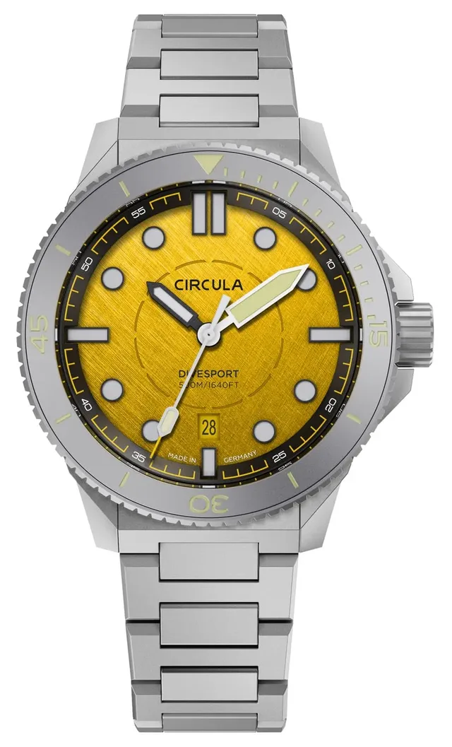 In Keltern nahe der Schmuck- und Uhrenstadt Pforzheim baut Circula überwiegend sportliche Zeitmesser, die oftmals über besondere Ausstattungsmerkmale wie Saphirglaslünetten, vollflächig leuchtende Zifferblätter oder gehärtete Gehäuse verfügen. Bestseller sind die Taucheruhren der Marke, die sich an Designcodes der fünfziger bis siebziger Jahre anlehnen. (Eine Neuheit im Siebziger-Design finden Sie hier.)Ganz neu im Sortiment ist die DiveSport Automatik mit einem von Hand sandgestrahlten Gehäuse aus Titan Grade 2. Dank der Verwendung des Leichtmetalls für die 42 Millimeter große Uhrenschale und das Armband ist der Newcomer nicht nur sportlich ausgestattet, sondern auch leicht und somit angenehm zu tragen. Dank der hohen Wasserdichtheit bis 500 Meter, einer Gehäusehärtung auf 1.200 Vickers und gut ablesbaren Leuchtanzeigen macht die Taucheruhr alle sportlichen Aktivitäten mit. (Eine gestalterische Spezialität mit Aventurin-Zifferblatt gibt es hier.)