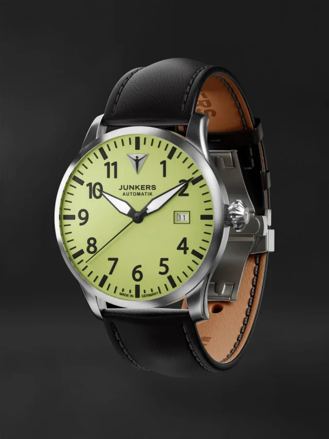 Die deutsche Uhrenmarke Junkers präsentiert mit dem Modell 100 Jahre Nachtflug eine Fliegeruhr mit vollflächig leuchtendem Zifferblatt.