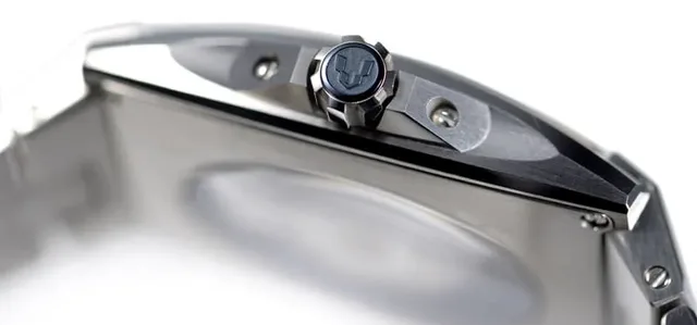 Die charakteristische Krone (gesichert durch einen Kronenschutz) trägt das Logo von Minase. Der stilisierte Bohrkopf ist eine Hommage an die Ursprünge der Marke. Die Muttergesellschaft Kyowa stellt seit 1963 Stufenbohrer und hochwertige Uhrenkomponenten für die Uhrenindustrie her.
