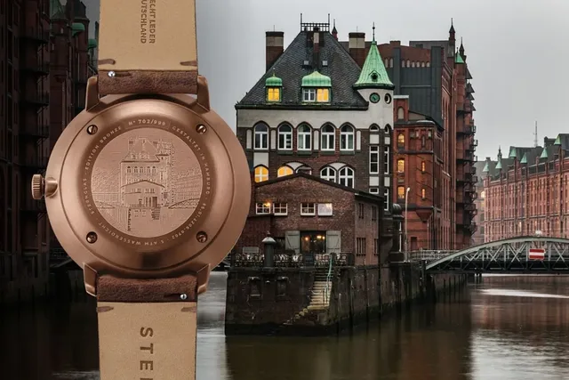 Die Kombination mit dem schilfgrün-satinierten Zifferblatt verschafft der neuen Hamburg Automatik Edition Bronze eine besondere Vintage Optik. Das bronzefarbene Gehäuse ist Schiffsschrauben nachempfunden und verleiht der Edition mit dem detailreichen Zifferblatt seinen maritimen Charakter. Als optisches Highlight dient der Sekundenzeiger in Signalorange. Auf der Gehäuserückseite befindet sich neben der Limitierungsnummer die Editionsgravur des berühmten Wasserschlosses aus der Hamburger Speicherstadt, das seit 2015 zum UNESCO Weltkulturerbe zählt.