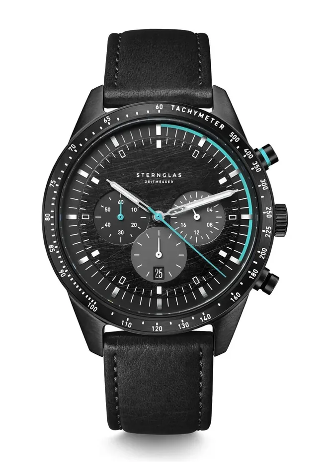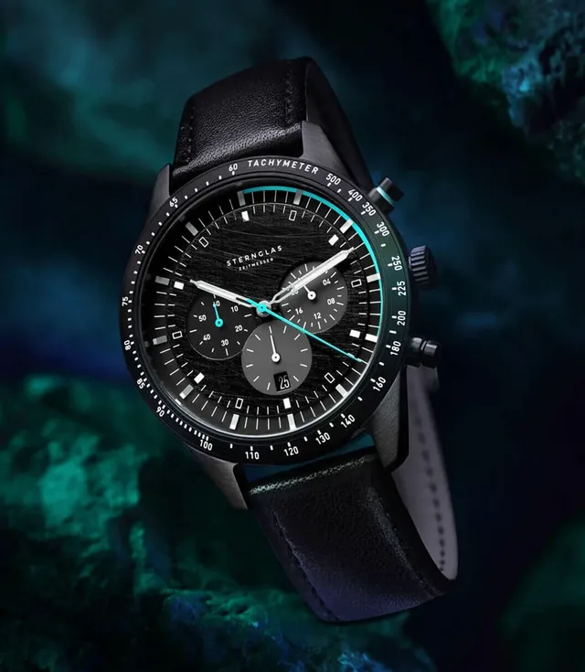 Die neue Edition Meteor schöpft Inspiration aus der faszinierenden Weite des Sonnensystems. So erinnert der kunstvolle Kreuzschliff des Mulit-Layer-Zifferblattes an die Beschaffenheit von Meteoriten und versprüht dabei kraftvollen Charme.Das gebürstete Gehäuse aus rostfreiem 316L Edelstahl ist für zusätzliche Kratzfestigkeit mit einer schwarzen PVD-Beschichtung versehen. Dadurch erhält der Tachymeter Edition Meteor eine sportliche, maskuline Optik, die das Auge sofort anzieht. Flaches, doppelt entspiegeltes Saphirglas hält den Zeitmesser schlank und sorgt zugleich für ein optimal geschütztes Zifferblatt.Weitere Informationen zum Sternglas Tachymeter Meteor erhalten Sie unter: www.sternglas.de