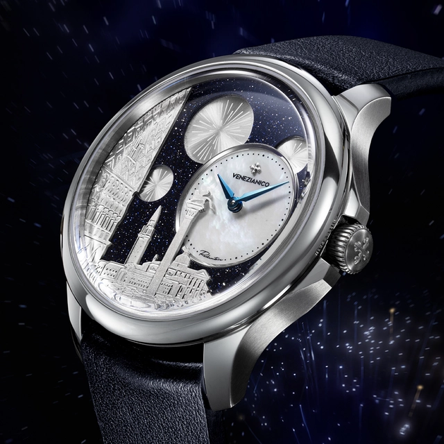 VenezianicoDie vierstufige Konstruktion der Uhr beginnt mit einem Sternenhimmel aus Aventurin, gefolgt von einem kleinen dezentralen Perlmuttzifferblatt, das den Mond symbolisiert. Eine satinierte Scheibe stellt die Feuerwerke dar, während im Hintergrund ein Basrelief des Dogenpalasts und der Kirche San Giorgio Maggiore, beide rhodiniert, zu sehen ist. Dieses Zusammenspiel fängt die nächtliche Magie des Markusplatzes ein.