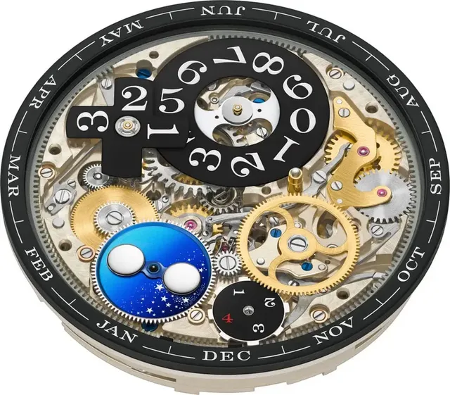 Konsequenterweise liegen auch die Zahlen des Großdatums und der Schaltjahresanzeige auf schwarzen Scheiben, sodass der Hintergrund der Mondphase den einzigen Farbpunkt bildet. In diesem versteckt sich eine Tag-Nacht-Anzeige, denn in 24 Stunden verändert sich die Farbe im Fenster von hellblau zu nachtblau. Der weißgoldene Mond (in Wirklichkeit sind es zwei Mondscheiben) läuft in 29 Tagen, 12 Stunden, 44 Minuten und 3 Sekunden von Neumond zu Neumond: Das ist so präzise, dass die Anzeige erst nach 122 Jahren um einen Tag korrigiert werden muss – später als das "ewige" Kalendarium, das bis zum 28. Februar 2100 richtig läuft.