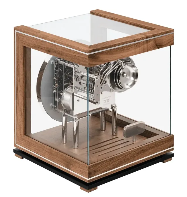 Die Tischuhr ist mit dem hochglanzpolierten Westminsterwerk W0352 ausgestattet, welches alle acht Tage aufgezogen wird. Dieses Werk schlägt alle 15 Minuten, zur vollen Stunde die Anzahl der Uhrzeit und kann bei Bedarf nachts dank der automatischen Nachtabschaltung ausgeschaltet werden (letzter Schlag 21:45 Uhr, nächster 7:00 Uhr). Der dezente Klang der Glocken sorgt für ein angenehmes Wohlbefinden in Ihren Räumlichkeiten. Der Aufzugsschlüssel ist in Chrom lackiert und befindet sich raffiniert vertieft hinter dem Uhrwerk.