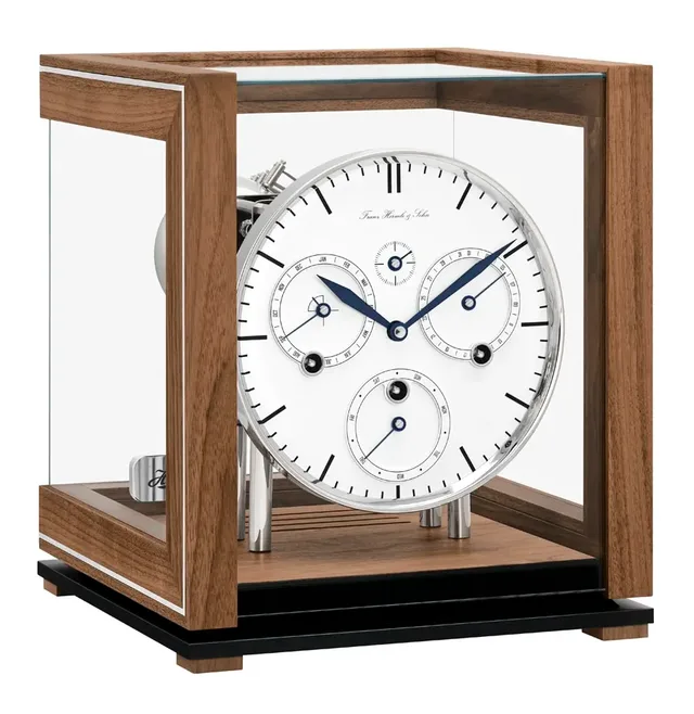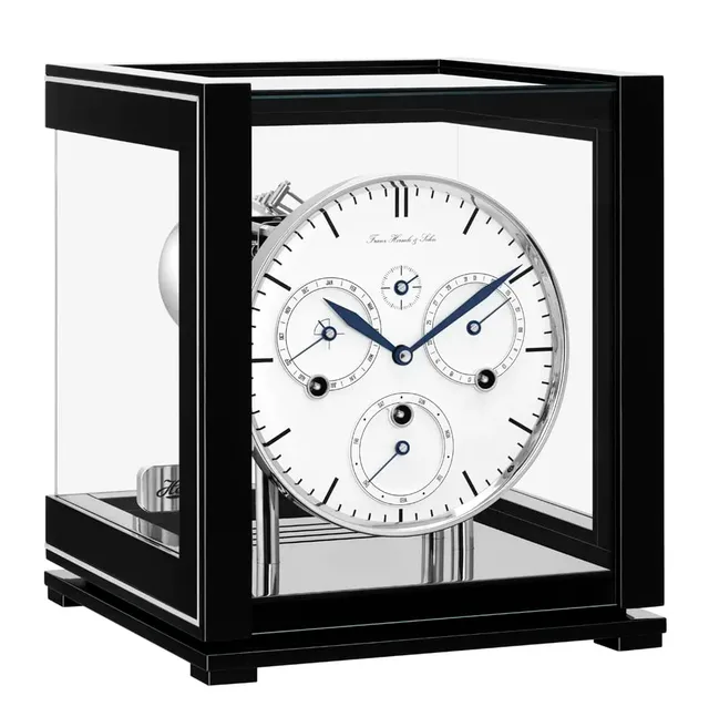 Bei dieser Uhr handelt es sich nicht nur um einen Zeitmesser, vielmehr ist es ein Designobjekt – zeitlos und exquisit. Neben der Uhrzeit ist das Datum, der Tag, der Monat und die Sekunde bemerkenswert ersichtlich. Das hochglanzpolierte Gehäuse sowie die polierten Intarsien aus Metall lassen diese Uhr hochmodern erscheinen.Weitere Informationen erhalten Sie unter: www.hermle-reichenbach.de