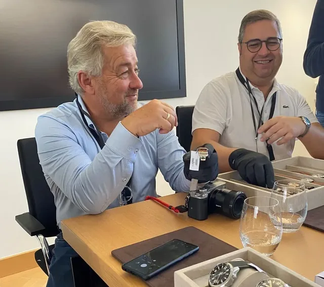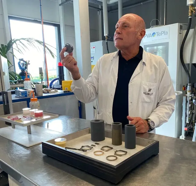 Am Nachmittag geht es hinaus aus Genf, ins Nachbarstädtchen Nyon. Die schon von der Autobahn aus sichtbare Manufaktur von Hublot besteht seit Jahren aus dem Stammhaus und einem zweiten Gebäude, doch selbst diese Platzverdopplung reicht für die stetig anwachsende und mittlerweile über 80.000 Uhren pro jahr betragende Produktion bald nicht mehr aus. 2025 soll das dritte Manufakturgebäude eingeweiht werden. Im zweiten sehen wir derweil die Produktion vieler verschiedener Werk- und Gehäuseteile, deren Vorzüge uns Jean-Pierre Kohler mit unnachahmlicher Verve erklärt. Kohler war früher mit seiner eigenen Gehäusefabrik selbst Lieferant von Hublot, bevor an die Marke verkaufte und bis zu seinem Ruhestand noch jahrelang in ihren Diensten war. Kohler gibt uns spannende Insights und sagt uns unter anderem, wie man gute von schlechten Messingarten unterscheidet, wie das kratzfeste Magic Gold (eine Legierung aus Gold und Keramik) entstand und wie Hublot knallig bunte Keramikfarben generiert. Auch hier ist der krönende Abschluss der Raum mit den Uhren, die nur einen Teil der unglaublichen Modellvielfalt abbilden können. Doch die, die da sind, ziehen uns schnell in ihren Bann, von den Classic Fusions und Big Bangs aus der regulären Kollektion über die Golfuhr bis hin zu Künstlereditionen wie der Big Bang Sang Bleu II oder der Orlinski in strahlend blauer Keramik.
