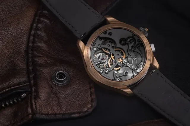Das von der Lehmann Präzision GmbH entwickelte und gefertigte Kaliber LH-1001 mit Handaufzug und 60 Stunden Gangreserve bietet außerdem eine Gangreserveanzeige mit zwei allmählich sich schließenden Lamellen, die sich auf dem Zifferblatt zwischen 8 und 9 Uhr befindet. Das Werk befindet sich in einem Innengehäuse aus Titan; das 41 mm große Außengehäuse, bestehend aus Seitenteil, Lünette und Gehäuseboden, ist genau wie der Kronendrücker aus Roségold gefertigt. Das braune Zifferblatt besteht aus Aluminium und passt farblich genauso gut zum Gehäuse wie zu den Zeigern und aufgesetzten Indizes, die jeweils im gleichen Ton vergoldet sind. Wie bei der ZM 1 in Stahl wird das Zifferblatt von einem bombierten und beidseitig entspiegelten Saphirglas geschützt, das an eine Kameralinse erinnert.
