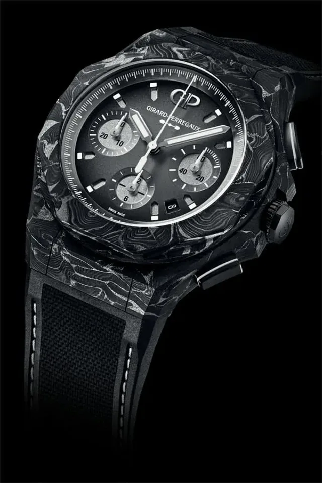 Dank seines Hightech-Gehäuses vermittelt der 44 Millimeter große und 15,15 Millimeter hohe Laureato Absolute Chronograph 8Tech eine kraftvolle Präsenz am Handgelenk und ist dennoch federleicht, denn das Hightech-Gehäusematerial ist fünfmal leichter als Stahl, aber vergleichbar robust und steif. Diese Eigenschaften sorgen für einen angenehmen Tragekomfort.Das Gehäuse besteht aus unidirektionalen, ungeflochtenen und vorimprägnierten Karbonfasern, die im Verbund mit leichtem Titanpulver zu extrem dünnen, nur 0,05 Millimeter „dicken“ Schichten verarbeitet werden. Diese Schichten werden übereinandergelegt und jeweils unterschiedlich ausgerichtet, wodurch sogenannte „Stapel“ entstehen, die dann in Achtecke geschnitten werden – eine branchenweite Neuheit. Die Achtecke werden in eine Gussform eingelegt und dort Hitze und extremem Druck ausgesetzt. Anschließend werden daraus die Gehäuseteile gefräst, einschließlich der Lünette, die dann von Hand veredelt werden. Diese einzigartige Technik verleiht dem Gehäuse einen schimmernden Glanz. Natürlich hätte Girard-Perregaux auch runde Formen herstellen können, doch das Achteck hat für die Manufaktur eine besondere Bedeutung. Seit der Einführung der ersten Laureato im Jahr 1975 ist diese Form zu einem Markenzeichen von Girard-Perregaux geworden.