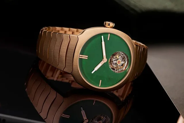 Gefertigt aus Wyoming-Jade – beheimatet getreu seinem Namen in Wyoming, USA – greift das grüne Zifferblatt den Charakter dieses außergewöhnlichen Materials auf, das durch seine feine natürliche Maserung und einzigartige Farbnuancen besticht. Durch die Beschaffenheit des Steins wird jedes Zifferblatt als Unikat gestaltet, um die ursprüngliche Struktur zu erhalten. (Auch interessant: H. Moser & Cie. Streamliner Small Seconds Blue Enamel – die Stahlsportuhr mit Emaillezifferblatt)Nur Jadesteine von höchster Qualität werden mit CNC-Technik in einer flüssigen Umgebung geschnitten, um hauchdünne Scheiben von 1 bis 1,2 mm Höhe zu erzeugen. Diese werden dann sorgfältig platziert, befeuchtet und unter Licht geprüft, um ihre optimale Position für das Ausschneiden der Zifferblätter zu bestimmen. Die so entstandenen Zifferblätter werden auf Metallplatten geklebt, CNC-gefräst und auf die gewünschte Höhe reduziert. Der letzte Schliff erfolgt durch das Handpolieren.