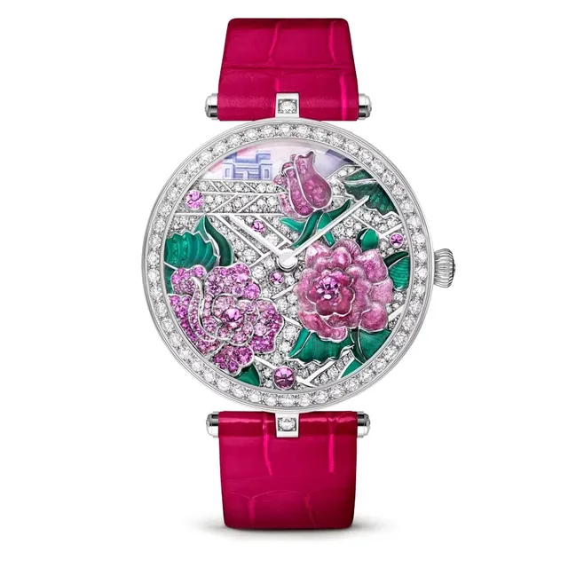Van Cleef & Arpels ist bekannst für seine detailreichen und fantasievollen Zifferblättern, die nur den feinsten Kunsthandwerkern gerecht werden. Die Lady Arpels Poème Rose Uhr schöpft ihre Inspiration aus Guillaume Colletets „La Rose“, einem Auszug aus La Guirlande de Julie, einem französischen Manuskript mit Liebesgedichten aus dem 17. Jahrhundert. Das 41 mm-Gehäuse aus rhodiniertem 18 Karat Weißgold mit Diamanten im Rundschliff wird von einer Lünette ebenfalls aus 18 Karat Weißgold mit Diamanten im Rundschliff ergänzt. Das Zifferblatt offenbart Rosen und Blätter aus 18 Karat Weißgold mit rosa Saphiren im Rundschliff auf feinsten Emaille-Verzierungen und Miniaturmalerei auf Weißgold. Dazwischen stechen Berge aus Weißgold mit Diamanten im Rundschliff und rosa Saphiren im Rundschliff hervor. Zwei austauschbare Armbänder aus glänzend fuchsiafarbenem und weißem Alligatorleder sind bei dem Modell inbegriffen. Angetrieben wird die Uhr von einem mechanischen Uhrwerk mit Handaufzug samt 40 Stunden Gangreserve. Die Uhr ist ein Einzelstück (Referenz: VCARO8YW00) und kostet 404.000 Euro./dp
