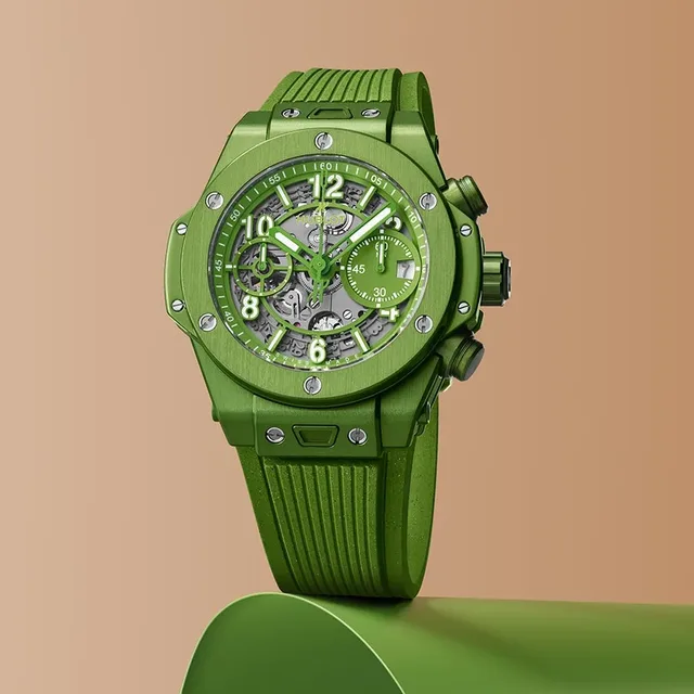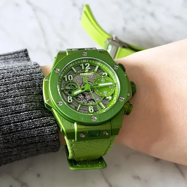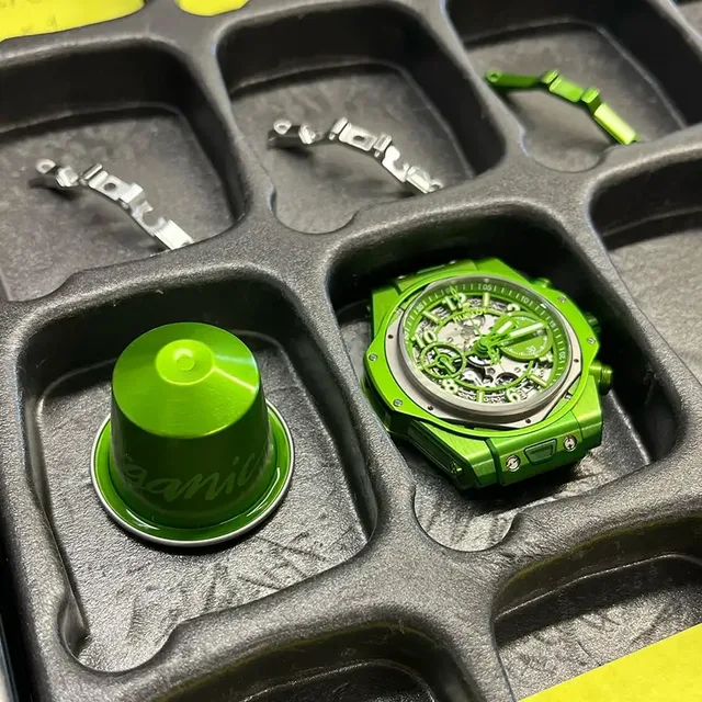 Für das farblich abgestimmte Kautschukband der Big Bang Unico Nespresso Origin wird der recycelte Kaffeesatz der Nespresso-Kapseln verwendet. Für das zusätzliche Textilarmband kooperiert Hublot mit SingTex, einem Partner von Nespresso, der bereits recycelten Kaffeesatz zur Herstellung eines Gewebes namens "SCafé" verwendet hat. Das zu 100 % recycelte Gewebe (bestehend aus 5 % Kaffeesatz und 95 % recyceltem Polyester) kommt erstmalig als Uhrenarmband zum Einsatz. Die Titanfaltschließe des Kautschukarmbands mit ihrer dekorativen Kappe aus recyceltem Aluminium und die Sportschließe des Klettverschlussbandes sind ebenfalls grün eloxiert.