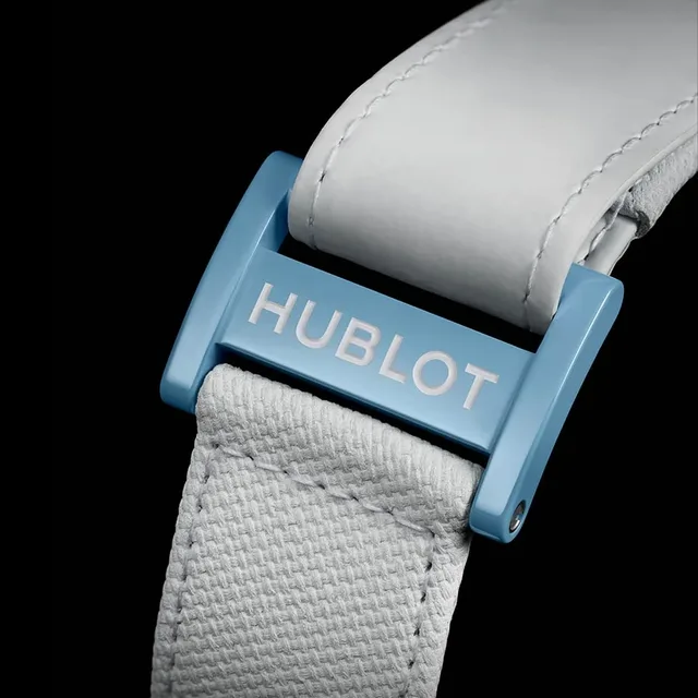 Als Armband der neuen Sommeredition kommt die Big Bang Unico mit einem hellblauen Kautschukband, ein weiteres, weißes Armband aus Textilmaterial lässt sich mit einem selbsthaftendem Sportverschluss unkompliziert anpassen.