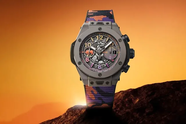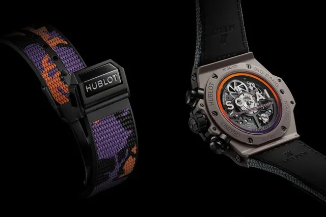 Das Gehäuse der 44 mm-großen Big Bang Unico SORAI besteht aus polierter und mikrogestrahlter, mattgrauer Keramik, das durchbrochene Zifferblatt wird aufgepeppt durch Stundenziffern und Markierungen in Schattierungen von Gelb, Orange, Violett und Rosa. Im Inneren schlägt das automatische Manufakturwerk Hub1280 Unico mit einer Gangreserve von 72 Stunden.