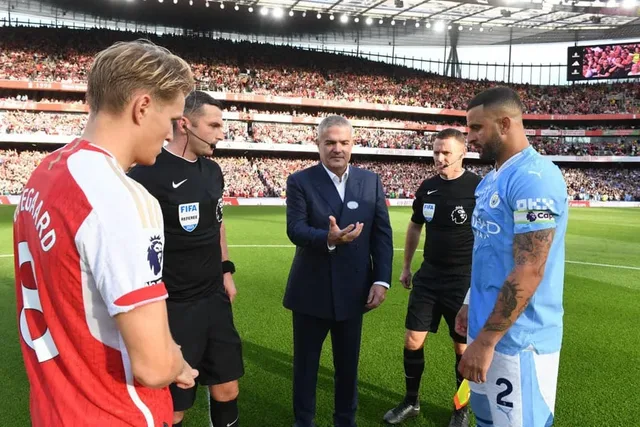 Hublot-CEO Ricardo Guadalupe beim Münzwurf vor dem Premier-League-Spiel zwischen Arsenal und Manchester City mit den Kapitänen Martin Ødegaard und Kyle Walker