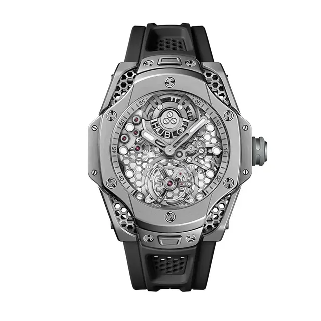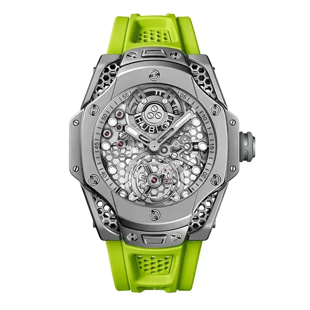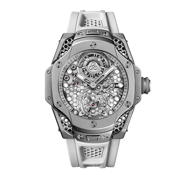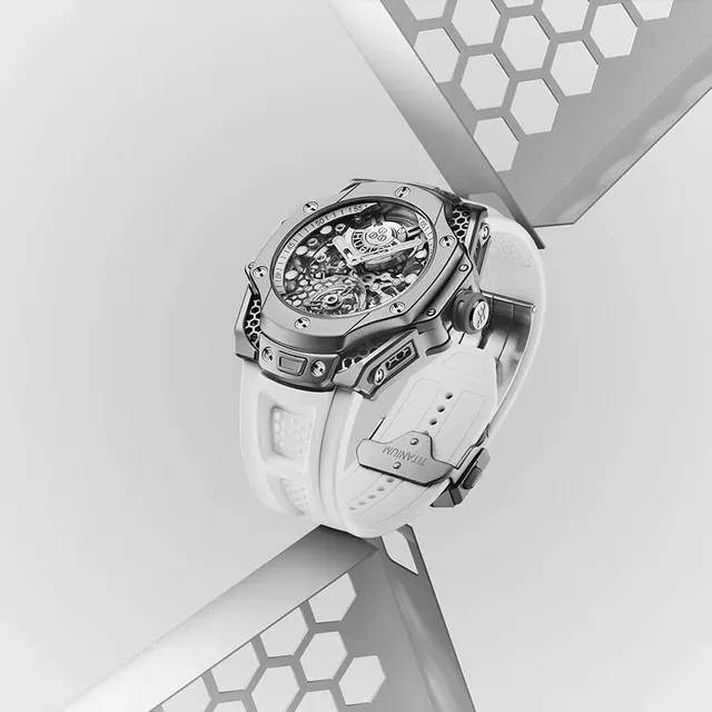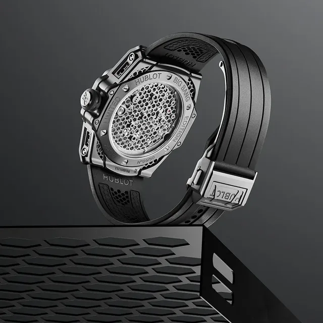 Die Zusammenarbeit zwischen Hublot und Samuel Ross begann 2020 und mündete in einer vollständigen Neugestaltung von Gehäuse, Krone, Zifferblatt, Armband und Lünette. Die neue Big Bang Tourbillon SR_A von Samuel Ross setzt dabei auf ein graues Gewand und kombiniert es mit einem der drei Kautschukarmbänder, die von leuchtendem Grün über Schwarz bis Weiß reichen. Um den industriellen Look zu betonen, sind die Gehäusekomponenten aus Titan gefertigt, einschließlich der Schließe, in die das Hublot-Logo eingraviert ist. Die Krone ist mit grauem Kautschuk ummantelt, während die Tourbillonbrücke in einem neutralen Farbton gehalten ist, sodass das Gehäuse mit den Vollkautschukarmbändern kombiniert werden kann. Mit der hexagonalen Wabenform und ihren sechs vollkommen gleichen Seiten hat Samuel Ross das vorherrschende Muster in der Natur gewählt, das an die Funktionalität einer Uhr erinnert.