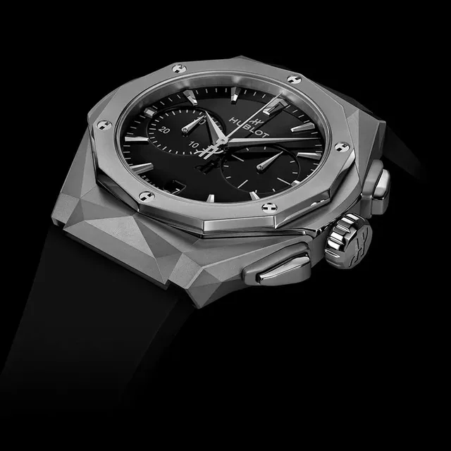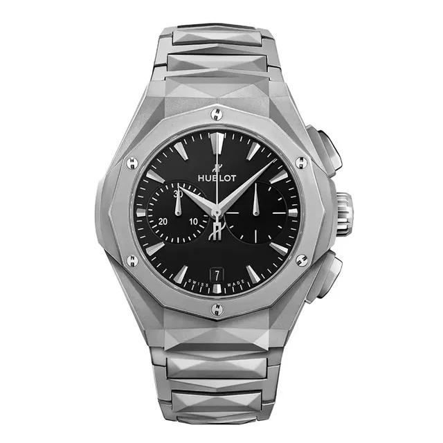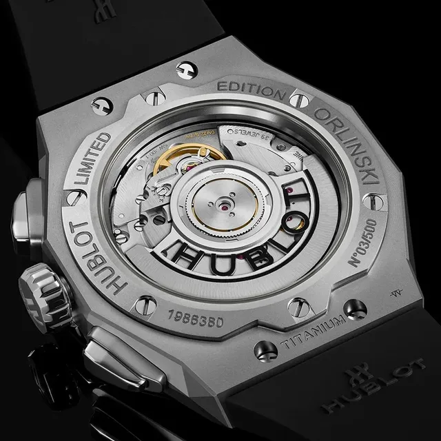 Ihre markante zwölfeckige Form verwandelt die Lünette in ein Polygon und das glasperlgestrahlte Titan hebt die Facetten matt hervor. Das Herzstück der Classic Fusion Chronograph Orlinski Titanium bildet das automatische Chronographenwerk HUB1153, ein Uhrwerk auf ETA-Basis mit einem Dubois-Dépraz-Werk.