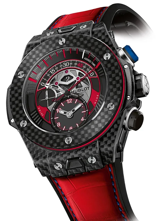 Und Hublot ist die erste Luxusuhrenmarke, die eine Partnerschaft im Bereich des Fußballs einging. Dabei konnte man nicht nur im Fernsehen riesige Hublot-Schriftzüge bei der Weltmeisterschaft und der Europameisterschaft sehen, sondern Hublot stellte mit der Big Bang Unico Chrono Retrograde auch eine echte Fußballuhr vor: Auf einem 45-Minuten-Kreissegment kann man die Halbzeit messen, ein zusätzlicher Bereich von 15 Minuten dient der Nachspielzeit.