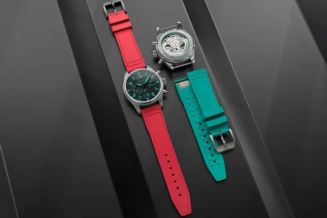 Die bisherige Ref. IW388108 mit blau-grünem Kautschukarmband wird weiterhin verfügbar sein und zusammen mit einem schwarzen Kalbslederarmband geliefert. Die neue Referenz mit dem Kautschukarmband in Miami Pink (Ref. IW388114) wird nur für einen begrenzten Zeitraum bei IWC Schaffhausen online sowie in der Boutique in Miami erhältlich sein. Dank des integrierten Schnellwechselsystems können die Armbänder einfach ohne zusätzliches Werkzeug ausgetauscht werden.