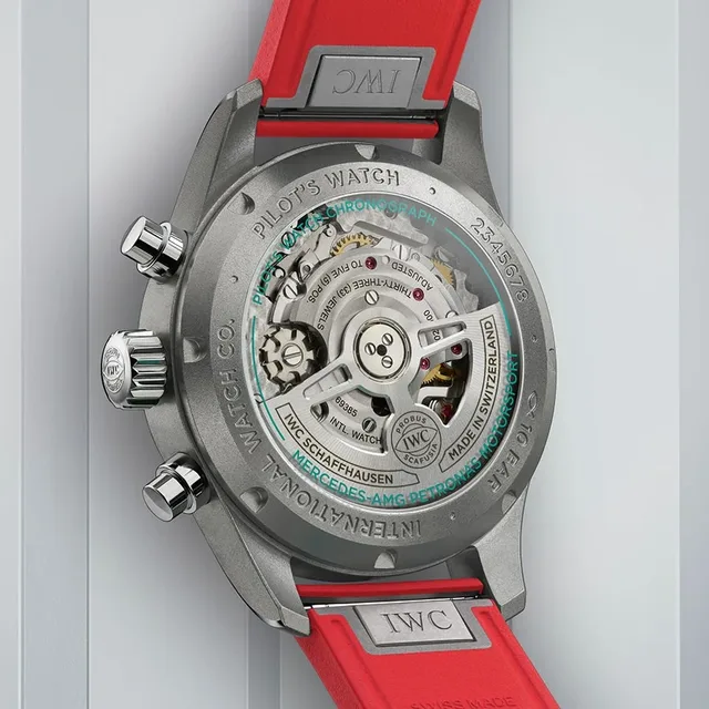 Die Pilot's Watch Chronograph 41 Mercedes-AMG Petronas Formula One Team ist aus Titan Grad 5 gefertigt. Das markante Design der Uhr wird durch ein schwarzes Zifferblatt mit Bedruckung und Leuchtelementen in der charakteristischen Team-Farbe Petronas-Grün abgerundet. Angetrieben wird der Chronograph vom Manufakturkaliber 69385.