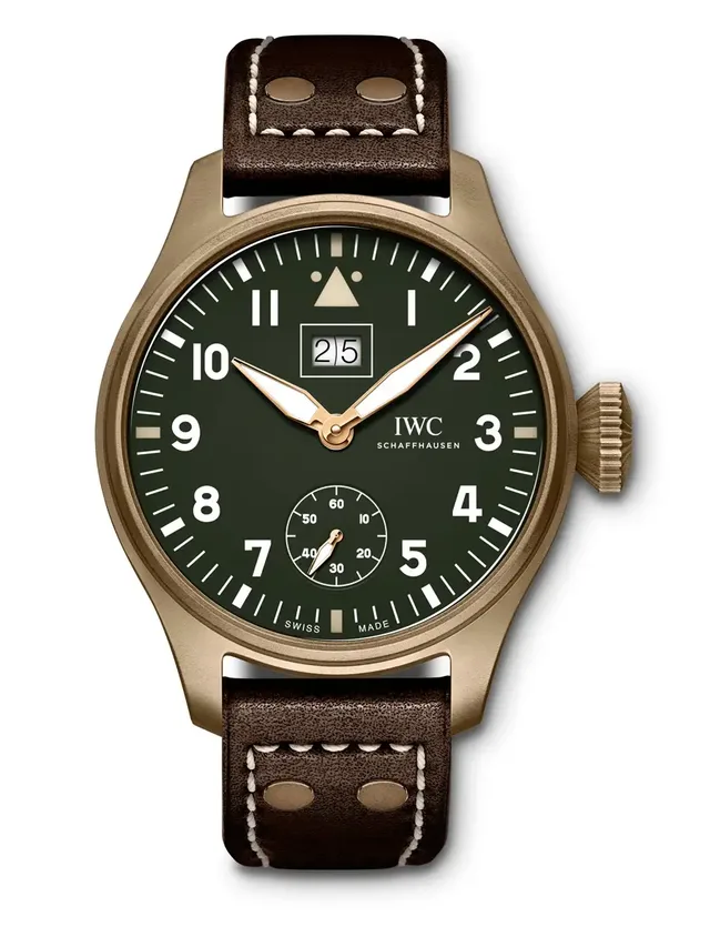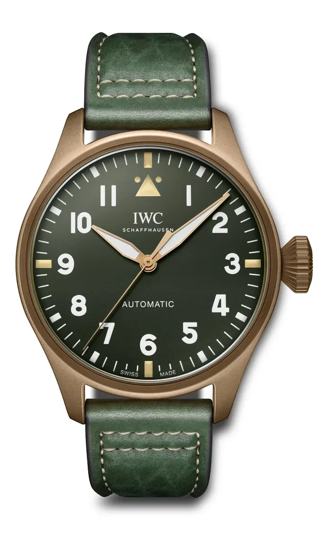 Die Big Pilot’s Watch 43 Spitfire gibt es auch mit klassischem Zifferblattdesign und einem Gehäuse aus Bronze. Dazu kombiniert die Marke ein dunkelgrünes Zifferblatt mit vergoldeten Zeigern. Um eine gute Ablesbarkeit bei Nacht zu gewährleisten, sind die Zeiger und Stundenmarkierungen mit Leuchtmasse beschichtet. Kostenpunkt: 10.800 Euro.