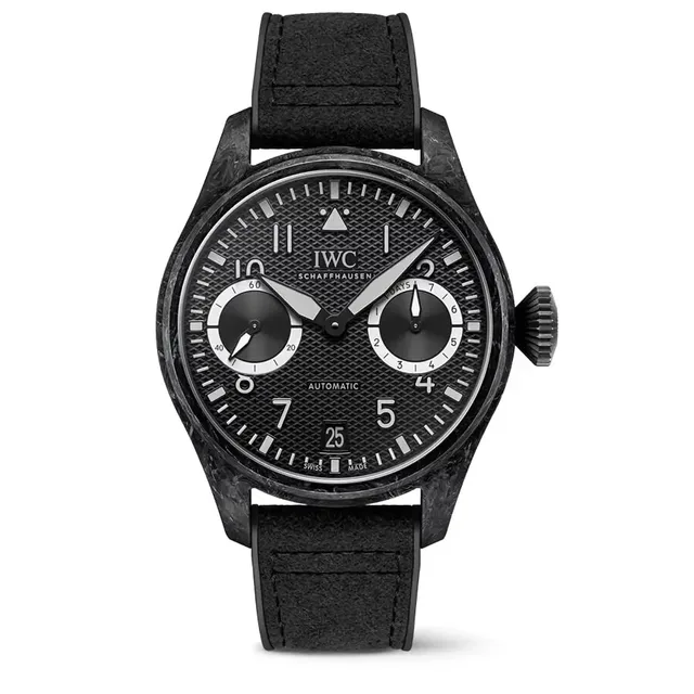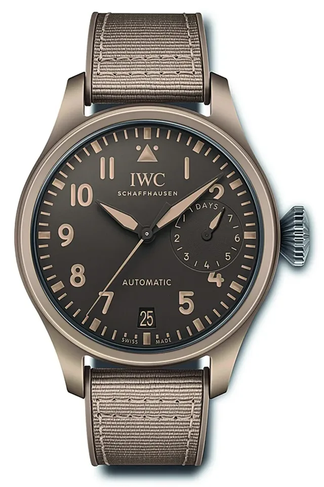 IWC versteht sich aber auch auf modernes Design: Bei den Top-Gun-Modellen sorgen ein mattschwarzes oder sandfarbenes (Mojave Desert) Keramikgehäuse und ein Band in Textiloptik für einen zeitgemäßen, militärischen Touch, und das unter Beibehaltung der anderen traditionellen Merkmale. Auch hier gibt es eine Big Pilot's Watch in der klassischen Größe von 46 Millimetern. Das Band sieht zwar aus wie Textil, besteht aber nun aus haltbarerem geprägtem Kalbsleder.