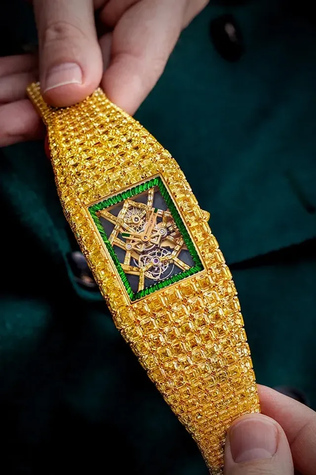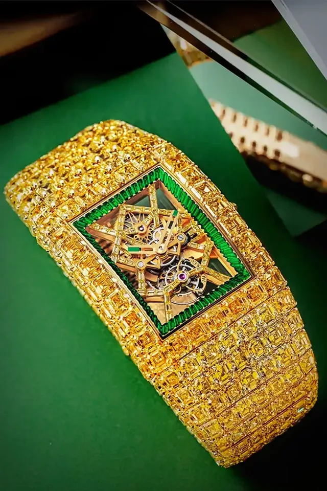 880 Karat gelbe Rohdiamanten wurden durch den anspruchsvollen Asscher-Schliff zu 216,89 Karat passenden Steinen geformt. Die 425 Edelsteine sind einzeln als Mosaik an das gebogene Design angelegt. Dabei lässt es Jacob & Co. jedoch nicht bewenden und verstärkt die Steine in Fancy Yellow und Fancy Intense Yellow mit einem einzigartigen grünen, umliegenden Ring aus Tsavoriten hinzu, der das Zifferblatt einrahmt. Das skelettierte Tourbillonwerk der Billionaire ist mit weiteren 57 gelben Diamanten im Baguetteschliff geschmückt.