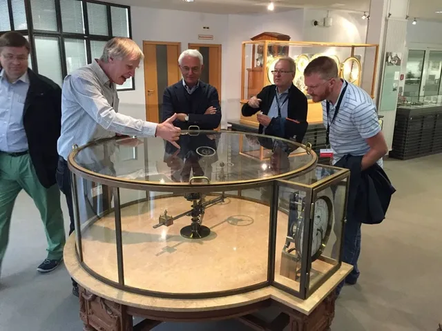 Nach dem PS-starken Vormittag macht sich die Reisegruppe auf nach Haigerloch, wo AHCI-Mitglied Sebastian Naeschke die Großuhrenmanufaktur Matthias Naeschke präsentiert, die er in zweiter Generation führt. Dieser Besuch steht erstmals auf dem Programm der Schwarzwaldreise und hat besondere handwerkliche Finessen zu bieten. Denn die Stärke dieses traditionsreichen Betriebs ist die handwerkliche Präzision der Fertigung, die extrem hohe Fertigungstiefe sowie die Verwirklichung von neuen Gedanken in der klassischen Uhrmacherei. Beginnend bei der Konstruktion und dem Bau der vergoldeten oder rhodinierten Werke, über den Entwurf der Gehäuse bis hin zu der Gestaltung sowie Fertigung von Zifferblättern und Zeigern entstehen nahezu alle Uhrenbestandteile im eigenen Haus. Auch die kleinsten Räder und Triebe werden selbst produziert, gehärtet und poliert. So entstehen hier neben Standuhren, Tischuhren und Regulatoren auch weltweit einmalig Flötenuhren und Orgeluhren.