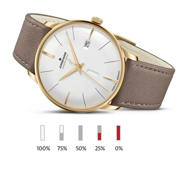 Bereits in den 1950er Jahren hatte Junghans eine mechanische Armbanduhr vorgestellt, die mittels farbiger Segmente in einer Zifferblattöffnung bei sechs Uhr anzeigte, wann sie wieder aufgezogen werden musste. Besonders klar und zugleich stilvoll dezent greifen die auf jeweils auf 160 Exemplare limitierte Editionen die Gangreserveanzeige nach dem historischen Vorbild auf.