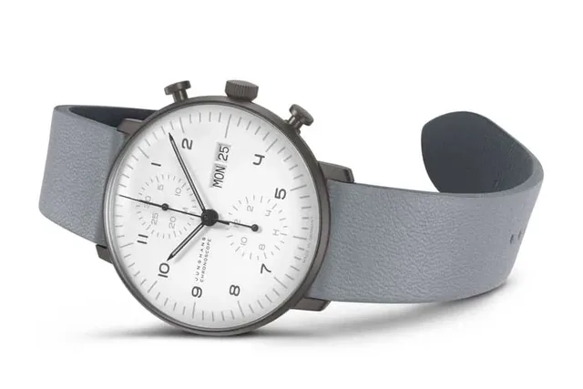 Junghans fertigt die Max-Bill-Uhren heute in vielen Varianten. Mit Handaufzugswerk oder automatisch gesteuert, mit farbigem Zifferblatt oder schlicht weiß. Es stehen diverse Bänder zur Auswahl, und es gibt Chronographen, bei Junghans Chronoscope genannt. Hier wurde das unverwechselbare Bill’sche Uhrendesign um eine Stoppfunktion erweitert, deren Gestaltung sich exakt an die formalen Vorgaben von Bills Dreizeigeruhren anlehnt.