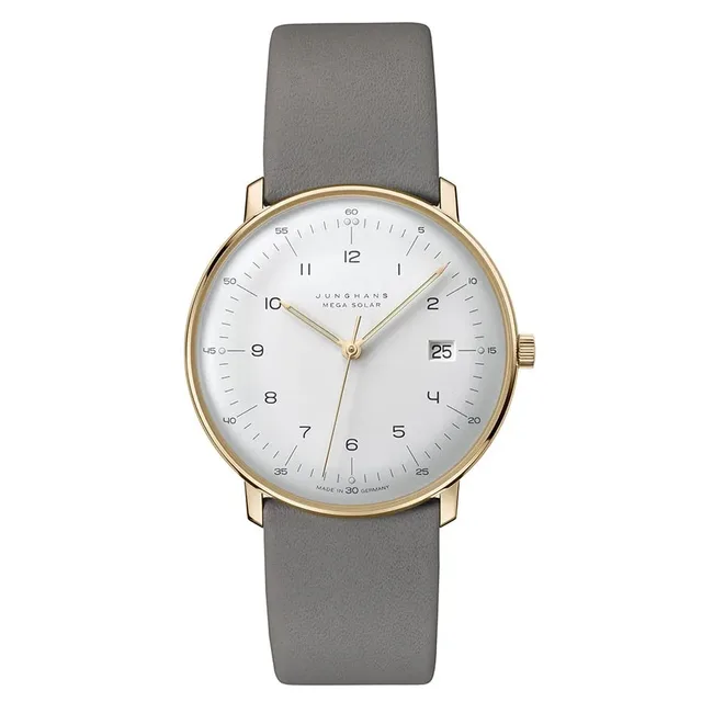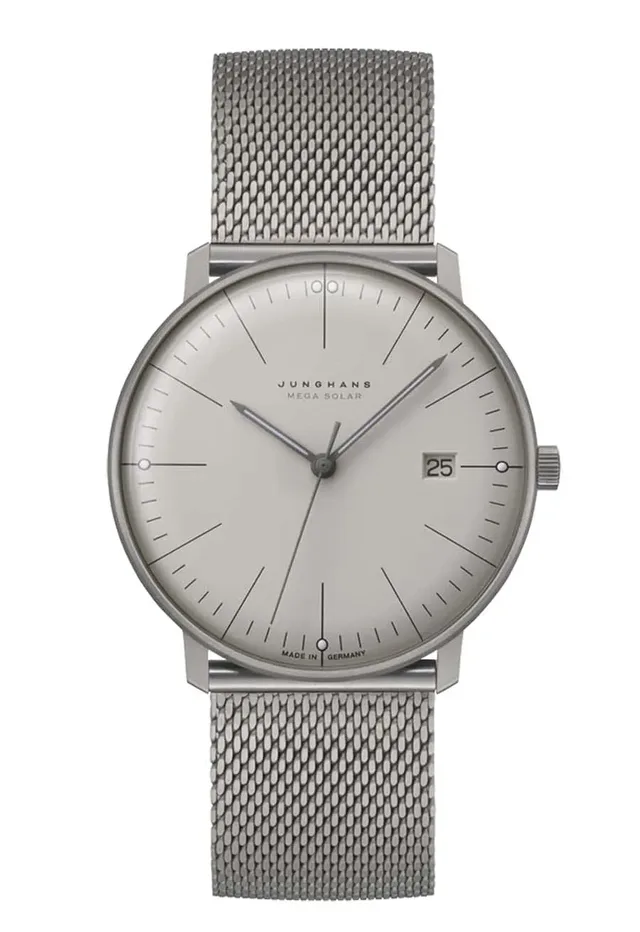 Die 38 Millimeter große Max Bill Solaruhr beherbergt das elektronische Junghans-Kaliber J101.85 und wird von einem Hartplexiglas mit kratzfester Beschichtung überspannt. Dank eines Titangehäuses ist die Funk-Solar-Uhr nicht nur präziser, sondern auch leichter als die bekannten Mechanikmodelle. Im Dunkeln läuft sie ganze drei Jahre weiter. Die Max Bill Mega Solar gibt es ebenfalls in verschiedenen Ausführungen. Die 38 mm-Version kostet 1.295 Euro.