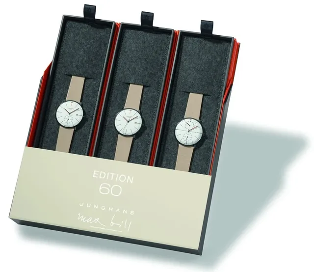 Der Bauhaus-Künstler Max Bill entwarf 1961 eine Serie mechanischer Armbanduhren für Junghans. Dieses 60-jährige Jubiläum ehrt der Uhrenhersteller in diesem Jahr mit der Sonderedition Max Bill Edition 60. Das auf 1.060 Stück limitierte Uhrenset besteht aus drei Modellen: Max Bill Automatic, Max Bill Mega Kleine Sekunde und Max Bill Regulator. Jede der Uhren kommt mit einem eigenen Etui in einer gemeinsamen Editionsbox. Diese zeigt auf ihrer Innenseite ein Porträt von Max Bill. Die Armbanduhren sind in den Farben Anthrazit, Beigegrau und Orange gehalten und besitzen jeweils ein 38 Millimeter großes Edelstahlgehäuse.