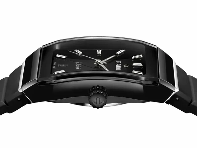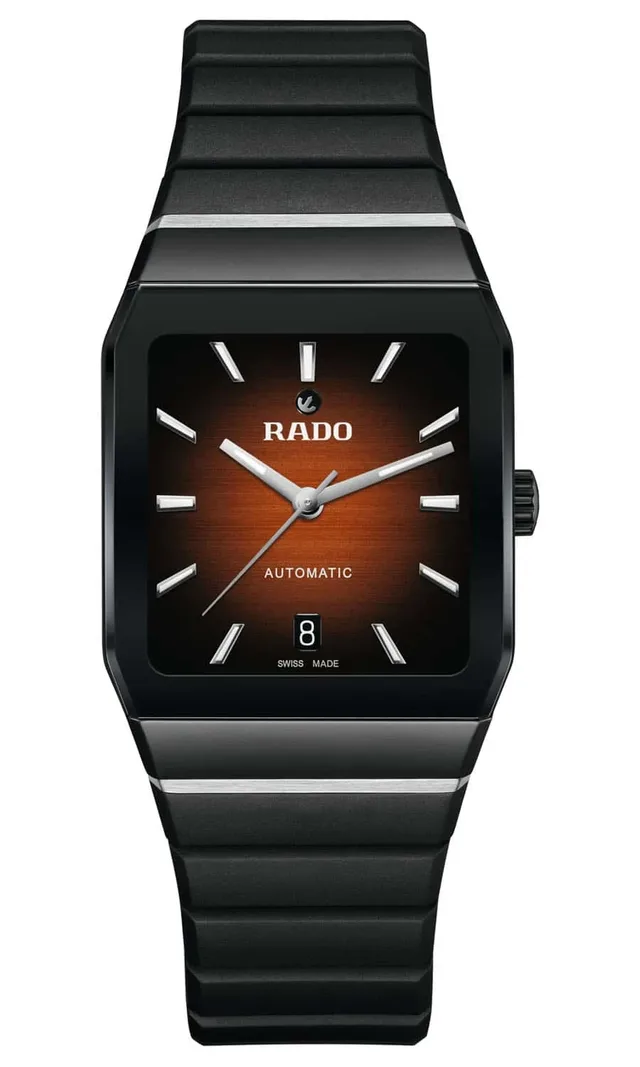 Rado steht als Marke für kratzfeste Uhren und starkes, preisgekröntes Design, das sich oft in anderen als der klassischen runden Form ausdrückt. All das kommt bei der neuen Anatom zum Tragen. Während die Ur-Anatom von 1983 ein Hartmetallgehäuse besaß, ist die heutige, wie man das inzwischen von Rado gewohnt ist, aus Hightech-Keramik gefertigt. Auch die Krone besteht aus Hightech-Keramik, das Gehäusemittelteil und der Boden wiederum aus schwarz PVD-beschichtetem Edelstahl. Die Form ist eng ans historische Vorbild angelehnt: ein Rechteckgehäuse mit abgeschrägten Ecken, das organisch ins Band übergeht.