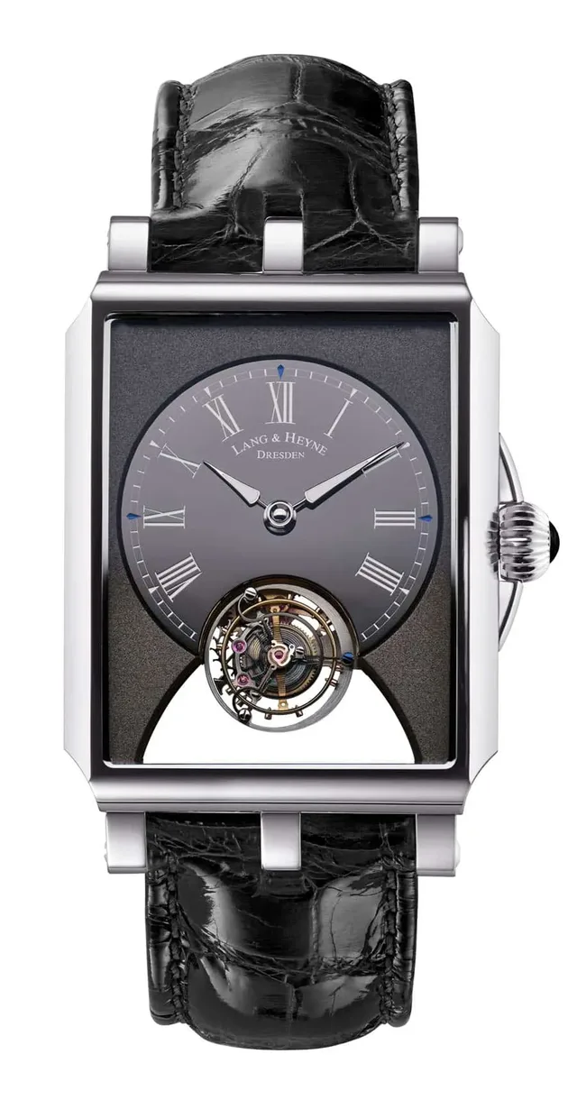 Lang & Heyne hat sich seit seiner Gründung im Jahr 2001 der Pflege der traditionellen uhrmacherischen Handwerkskunst verschrieben. Im Mittelpunkt stehen hochfeine, in mühevoller Handarbeit erzielte Dekorationen und ein oft historisch anmutender Werkaufbau, dazu eine hohe Fertigungstiefe und verschiedenste Möglichkeiten der Personalisierung. All dies findet sich im Spitzenmodell der Dresdner Manufaktur, der rechteckigen Tourbillonuhr Anton, wieder. Spektakulär ist das Handaufzugskaliber IX mit seinen vier gestuften Kloben, genauso aber das Zifferblatt. Im Gegensatz zu den bekannten Goldmodellen ist die neue und auf nur fünf Exemplare limitierte Anton „Manufaktur Edition“ mit ihrem Platingehäuse sehr kühl designt, sodass die klassische Uhrmacherei in einen spannenden Kontrast zu heutigen Sehgewohnheiten gestellt wird. Zum Gehäuse passt das runde Innenzifferblatt aus schwarzer Keramik, das umgeben ist von einer aufgerauten Grundplatte, die unten aufgeschnitten ist, sodass das Tourbillon richtig zur Geltung kommt.