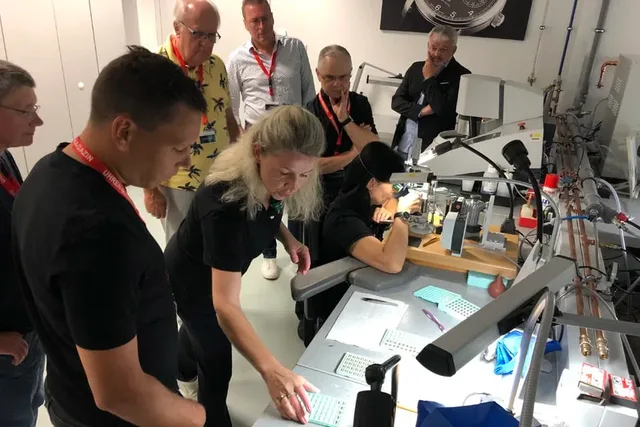 Premiere bei Union Glashütte: Wir sind die erste Gruppe von Uhrenenthusiasten überhaupt, die die Räumlichkeiten der Uhrenfabrik betreten dürfen, lässt uns Verkaufsleiter Armin Graeser wissen. Hochmotiviert führt er uns durch die Produktionsräume, wo in der Teilefertigung, Werk- und sogenannter Uhrenkopfmontage und mit einem umfangreichen Qualitätsmanagement die anspruchsvollen Anforderungen an die Glashütter Wertschöpfung erfüllt werden.