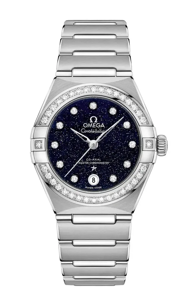 Ein richtiger Hingucker kommt aus dem Hause Omega mit der Constellation-Serie. Mit bis zu 150 verschiedenen Varianten hat diese Reihe eine sehr große Modellvielfalt. Hier ausgewählt ist eine 29 Millimeter große Edelstahlvariante mit Diamanten besetzter Lünette.