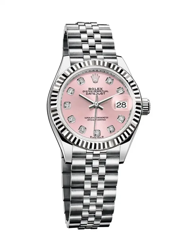 Das fünfreihige hier gezeigte Jubilé-Armband wurde einst eigens für die Datejust kreiert, kommt heute aber an verschiedenen Rolex-Modellen. Berühmte Fans der Datejust sind beispielsweise Rihanna, Jennifer Aniston oder Hillary Clinton. Antrieb liefert der Uhr das hauseigene Automatikkaliber 2236. Das hier gewählte rosafarbene Ziffernblatt ist mit Diamantindexen bestückt und wird von einer geriffelten Weißgoldlünette gerahmt. In dieser Ausführung kostet die Damenuhr 10.200 Euro.